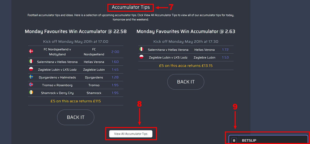 8. Bouton "Voir toutes les prévisions sur les accumulateurs" ("View All Accumulator Tips"). En cliquant sur ce bouton, vous pouvez consulter un tableau plus détaillé des pronostics des paris-accumulateurs.